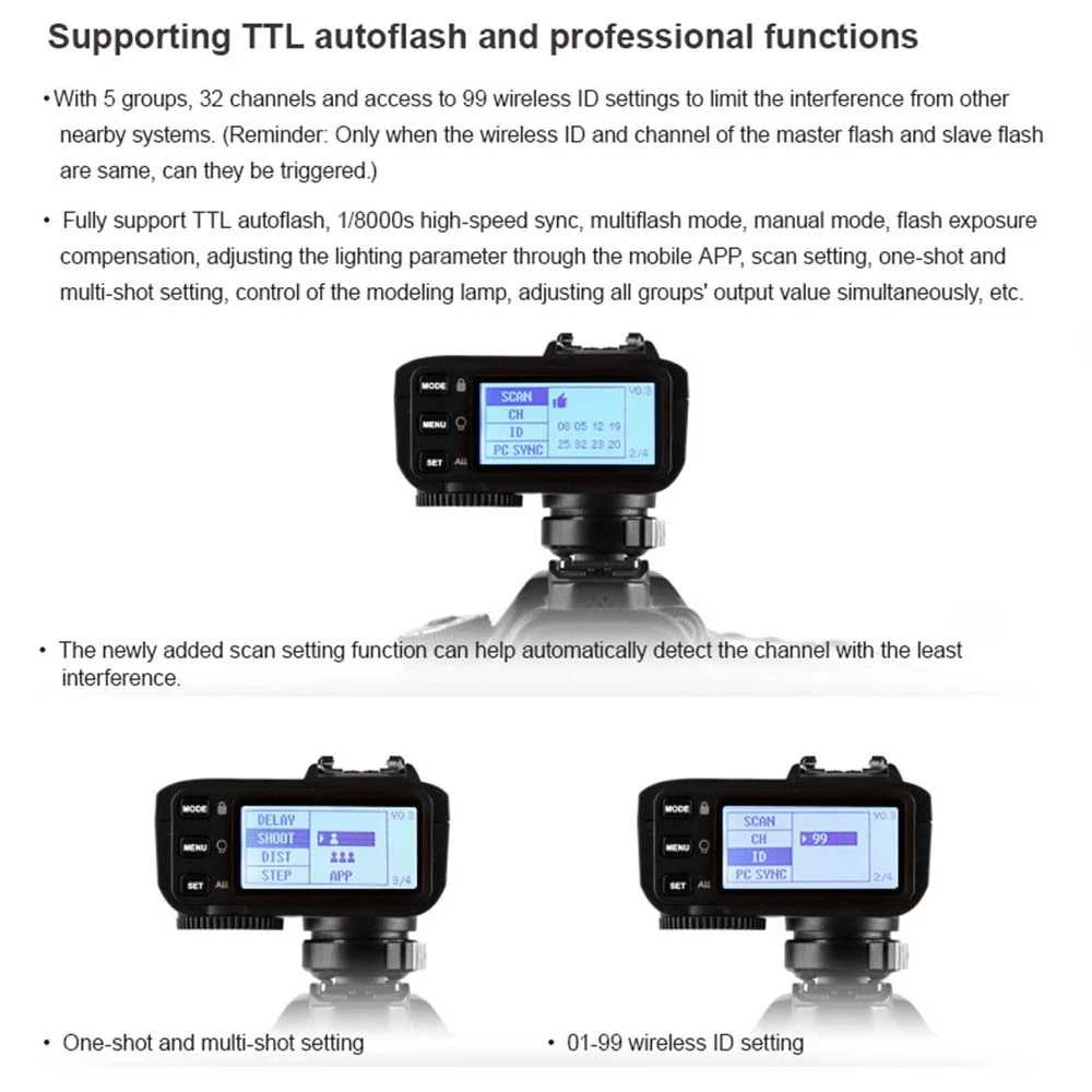 TTL-Blitzautomatik und professionelle Funktionen: TTL-Blitzautomatik, 1 / 8000s-Hochgeschwindigkeitssynchronisation, Mehrfachblitz, manueller Blitz, Blitzbelichtungskorrektur, Scaneinstellung, Ein- und Mehrfacheinstellung, Steuerung der Einstelllampe, Einstellung aller Gruppen Ausgabewert gleichzeitig usw.