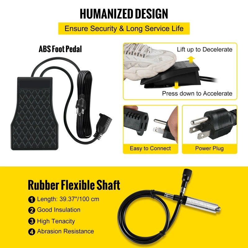 Das Fußpedal besteht aus hochwertigem ABS-Kunststoff mit langlebiger Festkörperelektronik. Sein ergonomisches Design ermöglicht eine präzise und zuverlässige Geschwindigkeitssteuerung mit dem Fuß, sodass Ihre Hände und Konzentration auf die Arbeit bleiben.