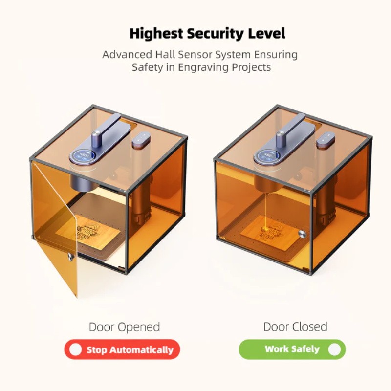 Hall-Sensor-System: Ein eingebauter Hall-Sensor unterbricht die Projektarbeit automatisch, sobald die Tür geöffnet wird, und setzt die Arbeit fort, wenn die Tür geschlossen wird. So können Sie sicher arbeiten und Ihre Gravur beruhigt präsentieren.