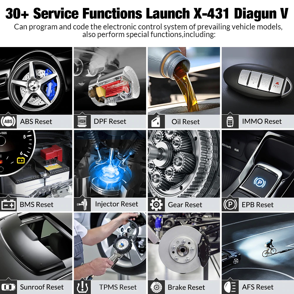 Begleiten mit kontinuierliche update von Launch X431 software und programm, Mehr funktionen wurde hinzugefügt: kopf leuchte, Sitz Passenden, Tür und Fenster Initialisierung Studie, Schiebedach Initialisierung, Luftfederung Passenden, getriebe Passenden, Injektor Kalibrierung, Multimedia Video Reset, Cluster Reset, Wegfahrsperre Service, Reifen Ändern Reset, (Abhängig von der spezifischen auto modelle, nicht für alle autos, ). Und mehr und mehr funktion wird verbessert werden und optimiert ....