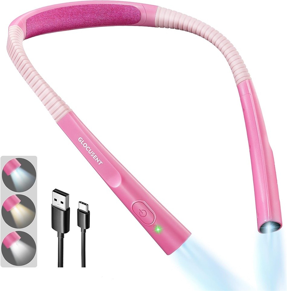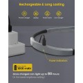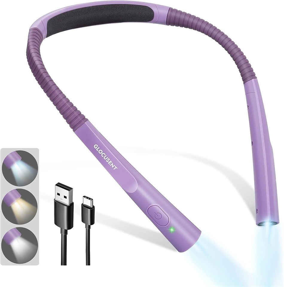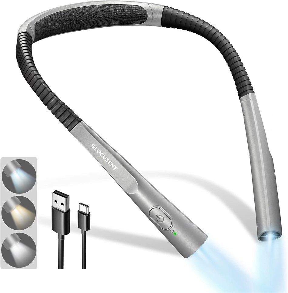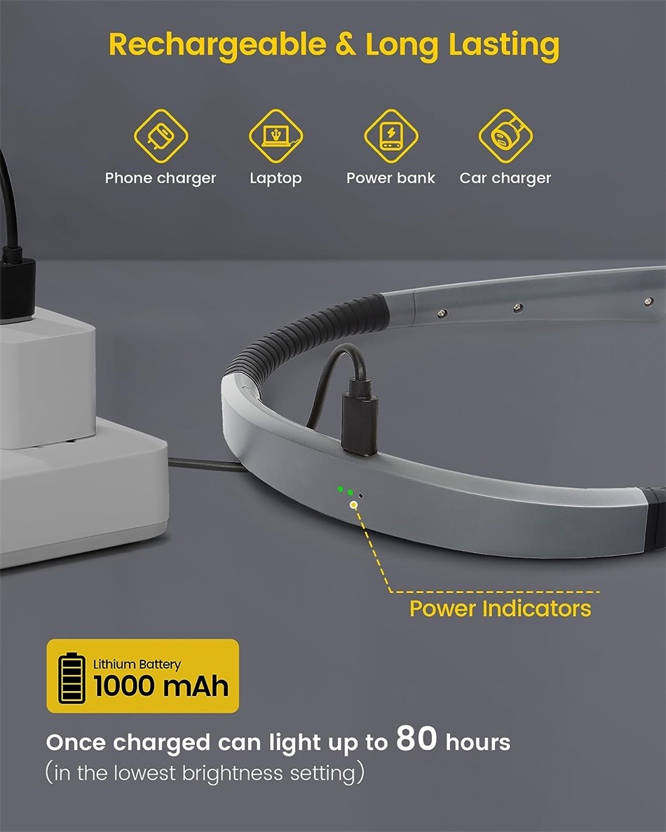 Es handelt sich um ein über USB-C wiederaufladbares Leselicht, das eine ungestörte Beleuchtung bietet. Dank des eingebauten 1.000 mAh-Akkus, der bis zu 80 Stunden auf der schwächsten Stufe leistet. Nach einer vollen Ladung können Sie Ihre Lektüre mindestens 20 Tage lang genießen, wenn Sie täglich 30 Minuten lesen, selbst auf der hellsten Stufe. Außerdem gibt es 3 Kontrollleuchten im Nackenbereich, die Sie daran erinnern, wann Sie die Leuchte aufladen müssen.