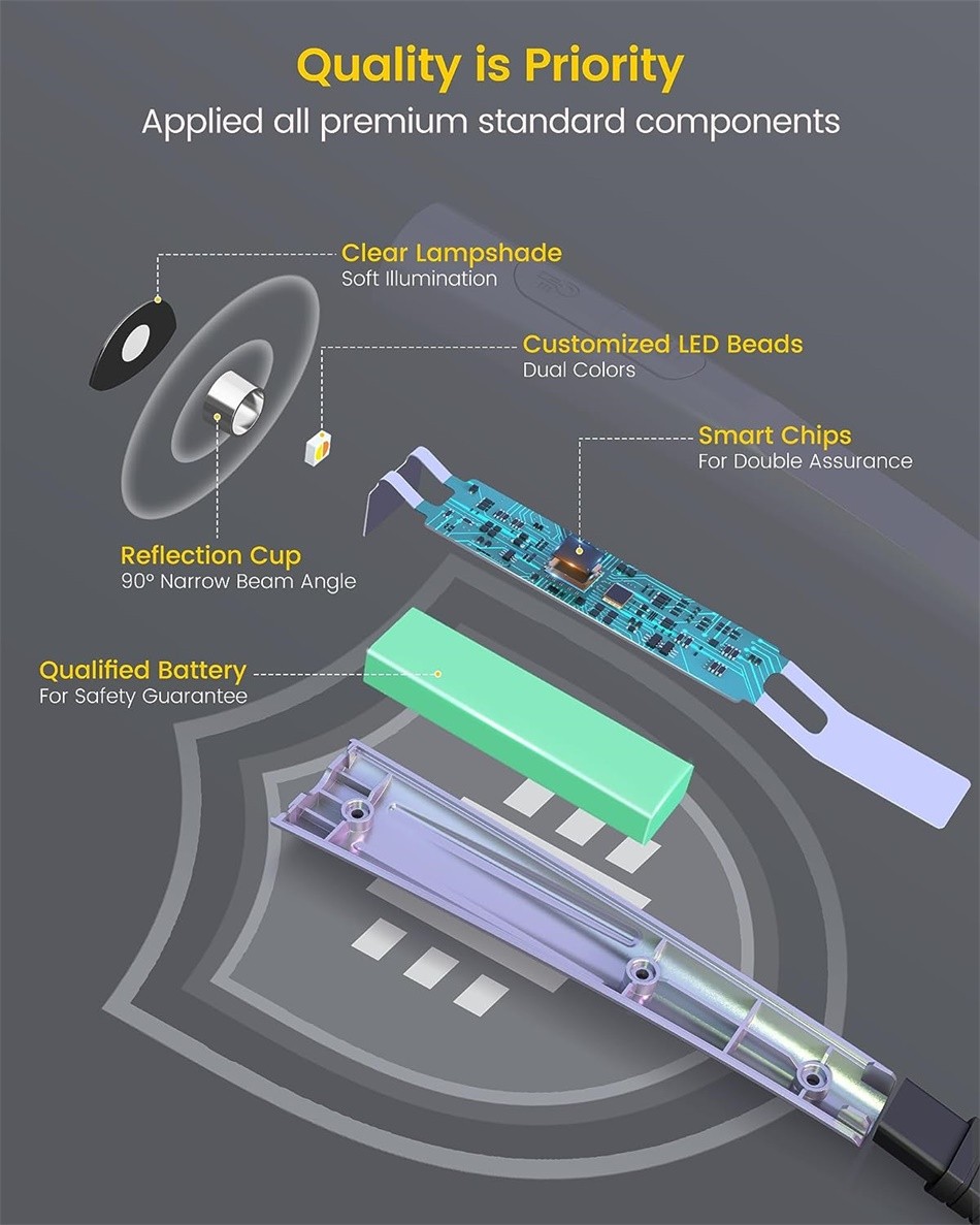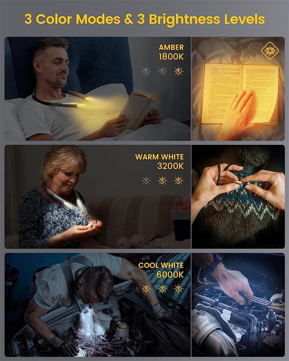3 Farbtemperaturen: amberfarbenes Licht (1.800 K)/kühles Licht (3.400 K)/kaltweißes Licht (6.000 K). Der 1.800 K Amber-Modus blockiert 99,99% blaues Licht für die Augenpflege und stimuliert die Melatoninproduktion. Wählen Sie amberfarbenes Licht zum Lesen im Bett, kühles Licht der Halslampe zum stricken und weißes Licht zum Reparieren. Außerdem ist dieses Leselicht in 3 Helligkeiten dimmbar; Sie können Einstellungen für verschiedene Zwecke wählen.