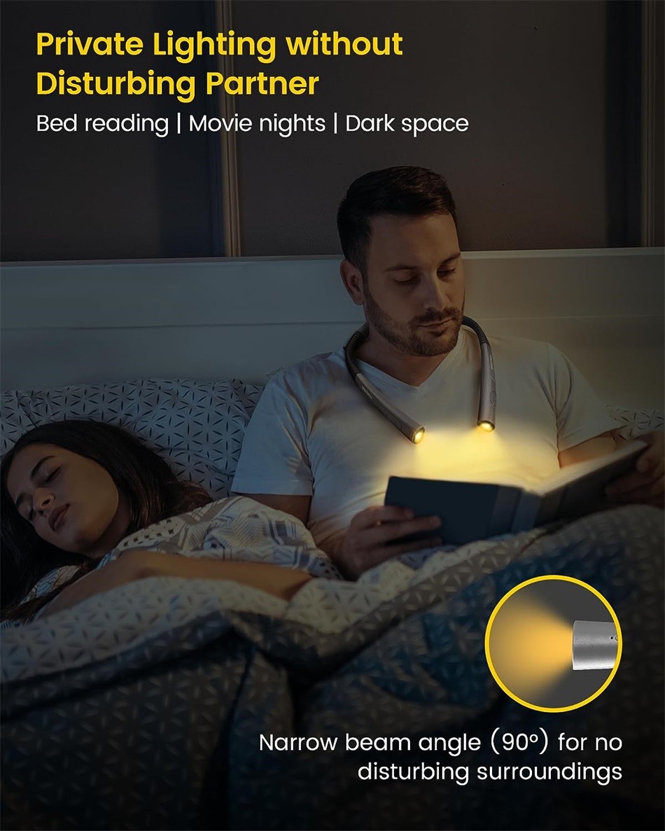 Der enge Abstrahlwinkel von 90° lässt Sie nur auf Ihren Fokus zielen, was Ihre eigene private Lesezone schafft, ohne Ihren Partner oder die Kinder neben Ihnen zu stören. Sie können diese Leselampe Buch auch verwenden, wenn Sie mit Ihrer Familie einen Filmabend im Wohnzimmer veranstalten; Sie können damit in Ihrer eigenen privaten Lichtblase stricken oder lesen.