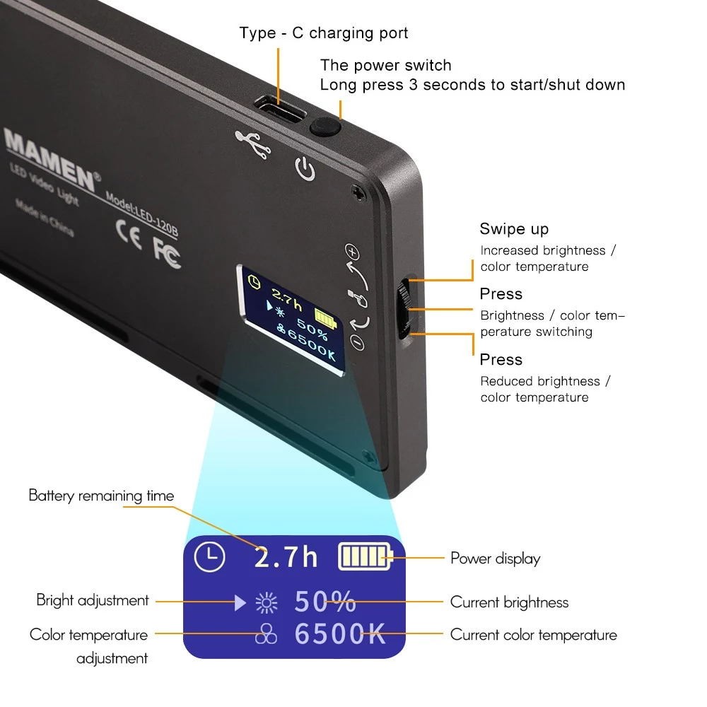Eingebauter wiederaufladbarer Li-Ionen-Akku mit 3000 mAh, der über die Typ-C-Schnittstelle aufgeladen werden kann; verfügt über ein genaues OLED-Display, das die Leistung, die verbleibende Akkulaufzeit, die Farbtemperatur und die Helligkeit anzeigt.
