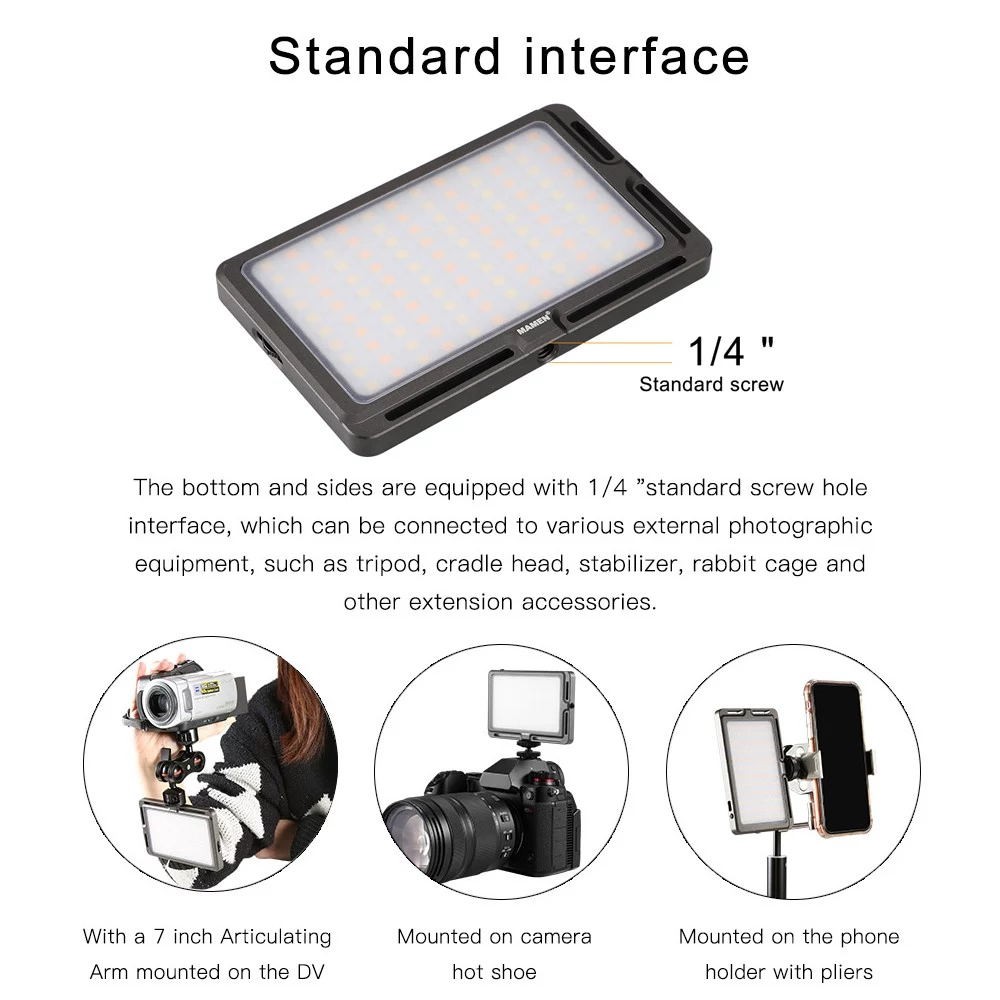 Mit zwei 1/4 Zoll Gewindeschnittstellen kann das Fülllicht an das Stativ und den Kamerakäfig angeschlossen werden. Sowohl horizontal als auch vertikal sind verfügbar und eignen sich für Selbstauslöser, Live-Übertragung, Videoaufnahmen, Fotoaufnahmen usw.