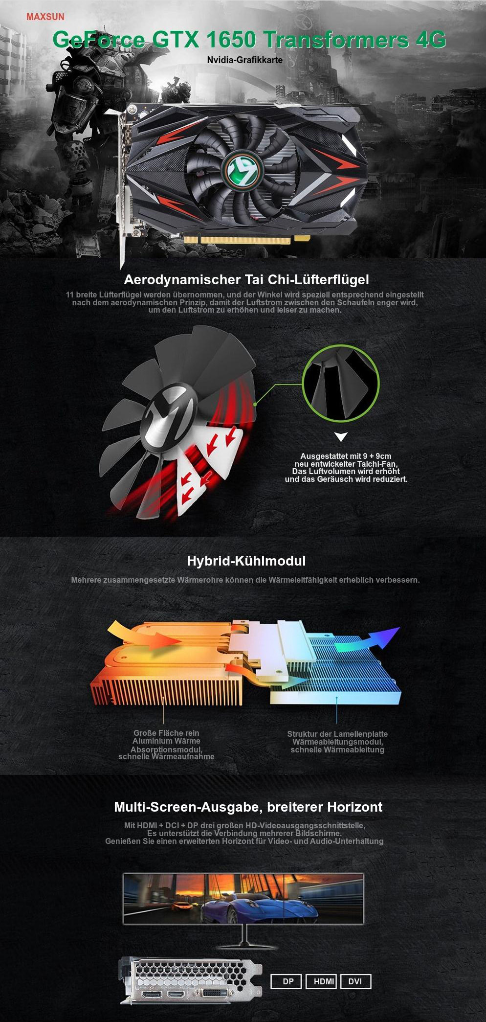 | Daten | Marke: Maxsun Modell: GeForce GTX 1650 Transformator 4G Chipset-Hersteller: NVIDIA Grafik-Chipsatz: GeForce GTX 1650 unterstützt System: Windows-10 Verfahrenstechnik: 12nm Motoruhr: Basis: 1485MHz, Boost: 1665MHz CUDA Kerne: 896 |