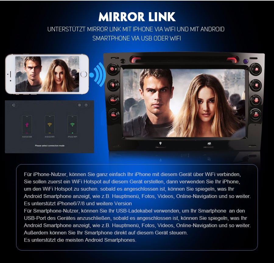 - Mirror Link Funktion: Ja, support Mirror Link für iphone und Android Smartphone