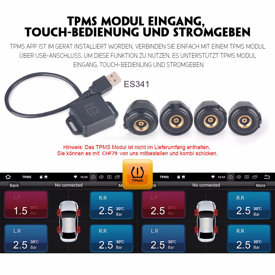 - TPMS App vorbereitet: Ja, verbinden Sie einfach einem TPMS Modul, um die Funktion zu benutzen