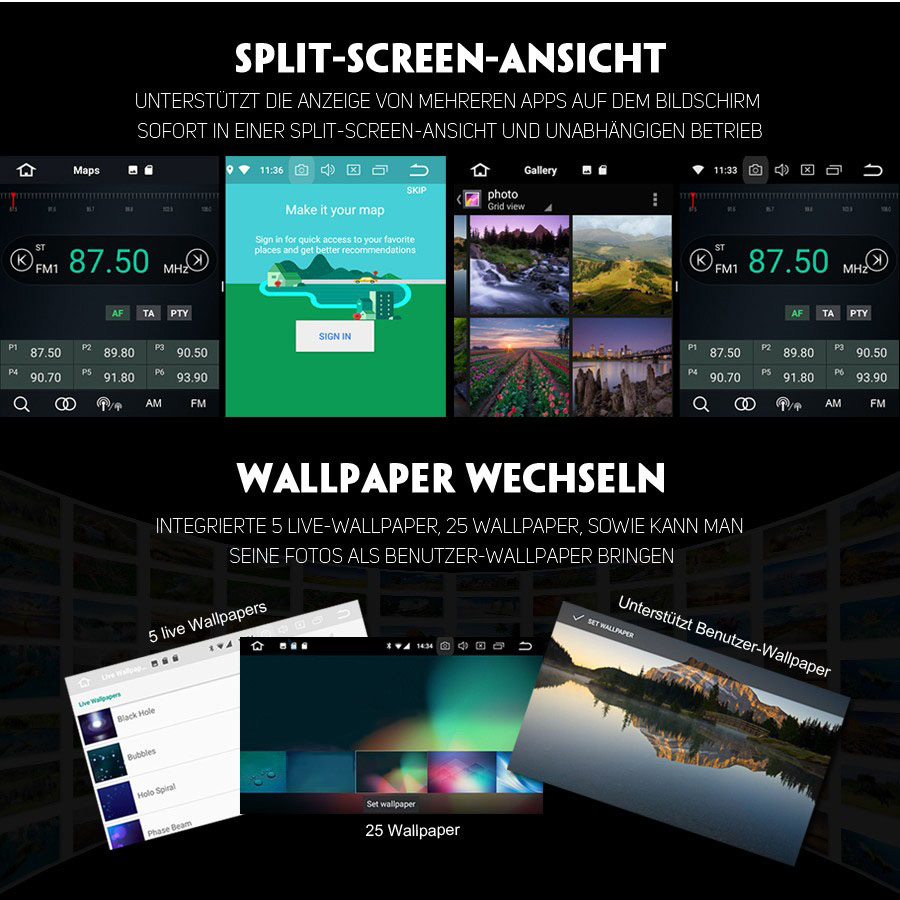 - DIY Hauptmenü display: Ja, Sie können Suchleiste, Musik/Radio/BT- Stereo Player oder Apps auf Hauptmenü ziehen