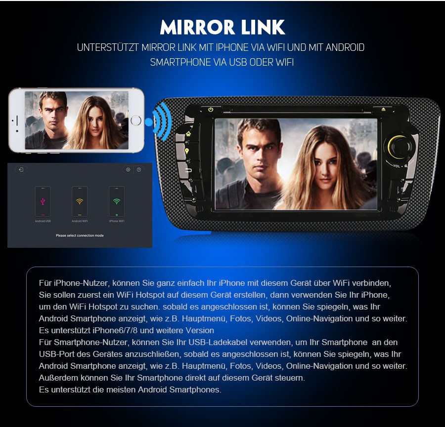 - Mirror Link Funktion: Ja, support Mirror Link für iphone und Android Smartphone