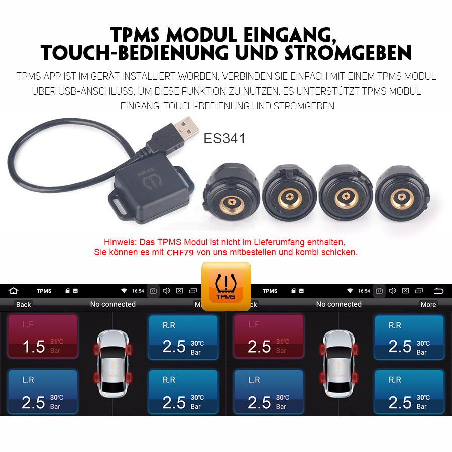 - TPMS App vorbereitet: Ja, verbinden Sie einfach einem TPMS Modul, um die Funktion zu benutzen