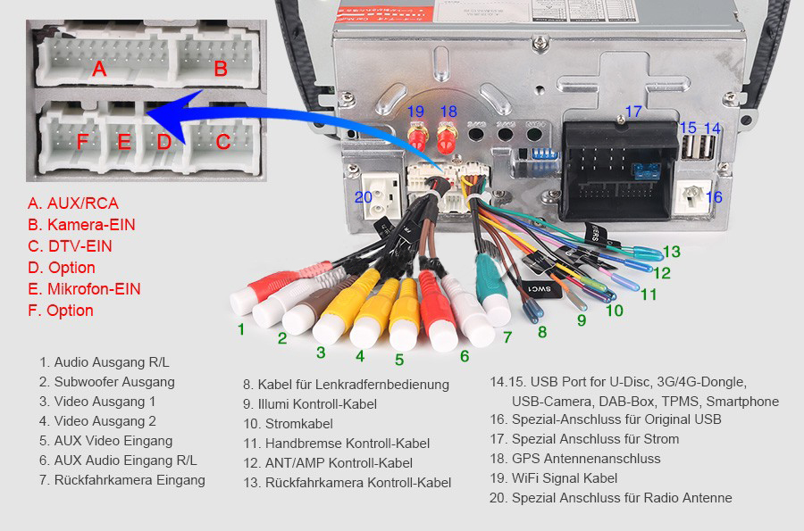 - Position: 3 USB auf dem Rücken, kann als Media/3G/4G/Kamera/DAB+/TPMS/Handy Anschluss