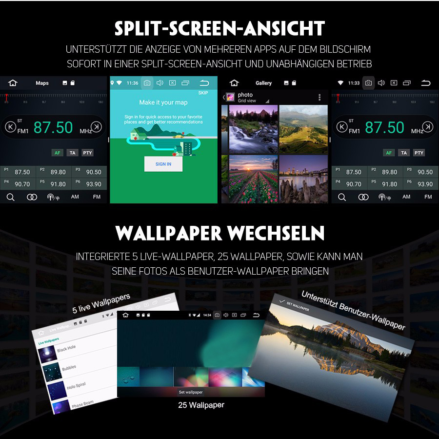- DIY Hauptmenü display: Ja, Sie können Suchleiste, Musik/Radio/BT- Stereo Player oder Apps auf Hauptmenü ziehen