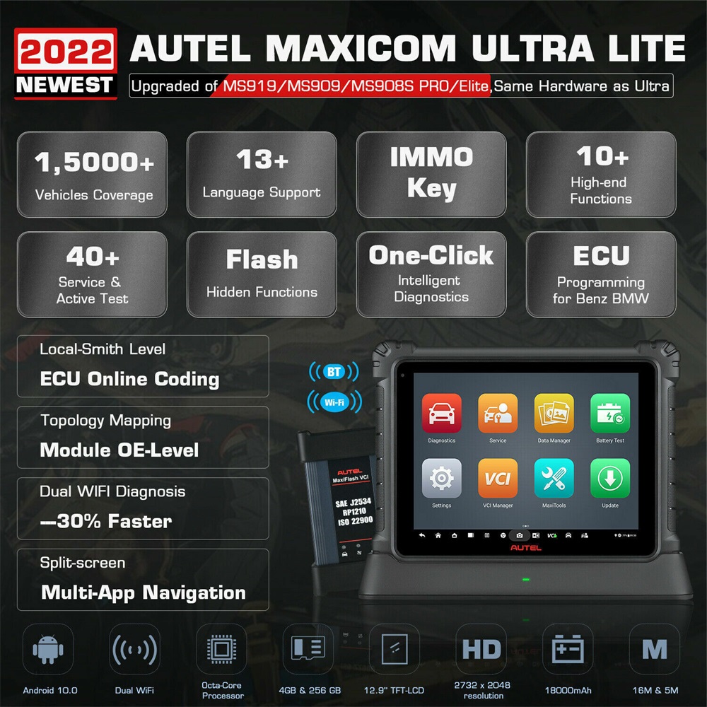 Autel Maxisys Ultra Lite diagnose tablet ist zu maximieren techniker intelligenz. Es verfügt über eine 12,9-zoll touchscreen tablet mit Android 7,0 OS angetrieben durch eine Octa-core prozessor (2,3 GHz Quad + 1,7 GHz Quad), erhebliche 256GB gebaut-in speicher, alle versorgung der neue split-screen multi-anwendung navigation zu bieten diagnose beratung und test komponenten zu bestätigen reparaturen.