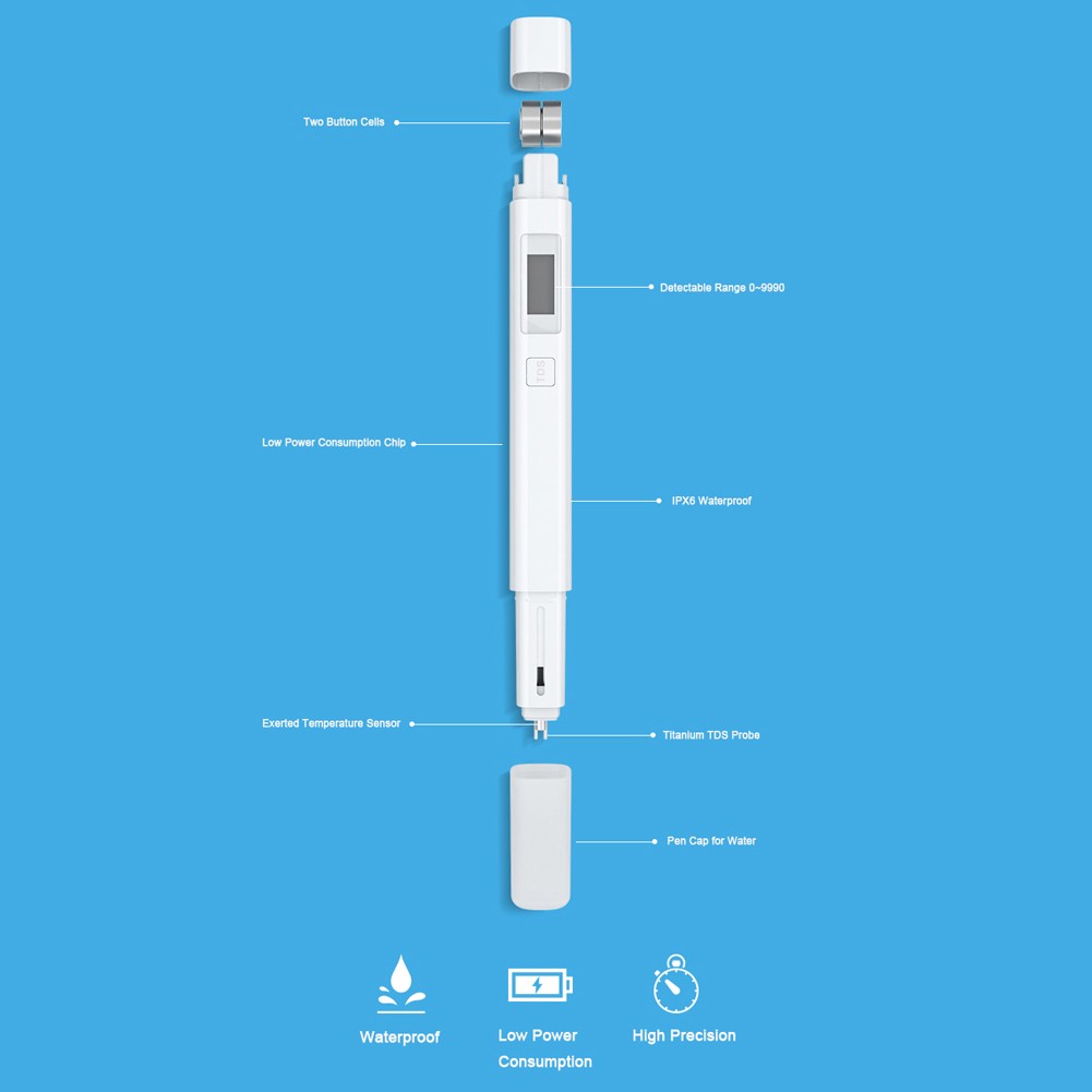 Pen , die die Qualität des Wassers testen, ist es bestimmt auch , ob die Reinigung erforderlich ist. Mi TDS Pen reagiert auf organische Verbindungen und Schwermetalle wie Nickel, Chrom usw. und löslichen Salzgehalt. Der Stift ist IPX6 wasserdicht und hat eine automatische Temperaturkalibrierung und Präzision bei der Messung.