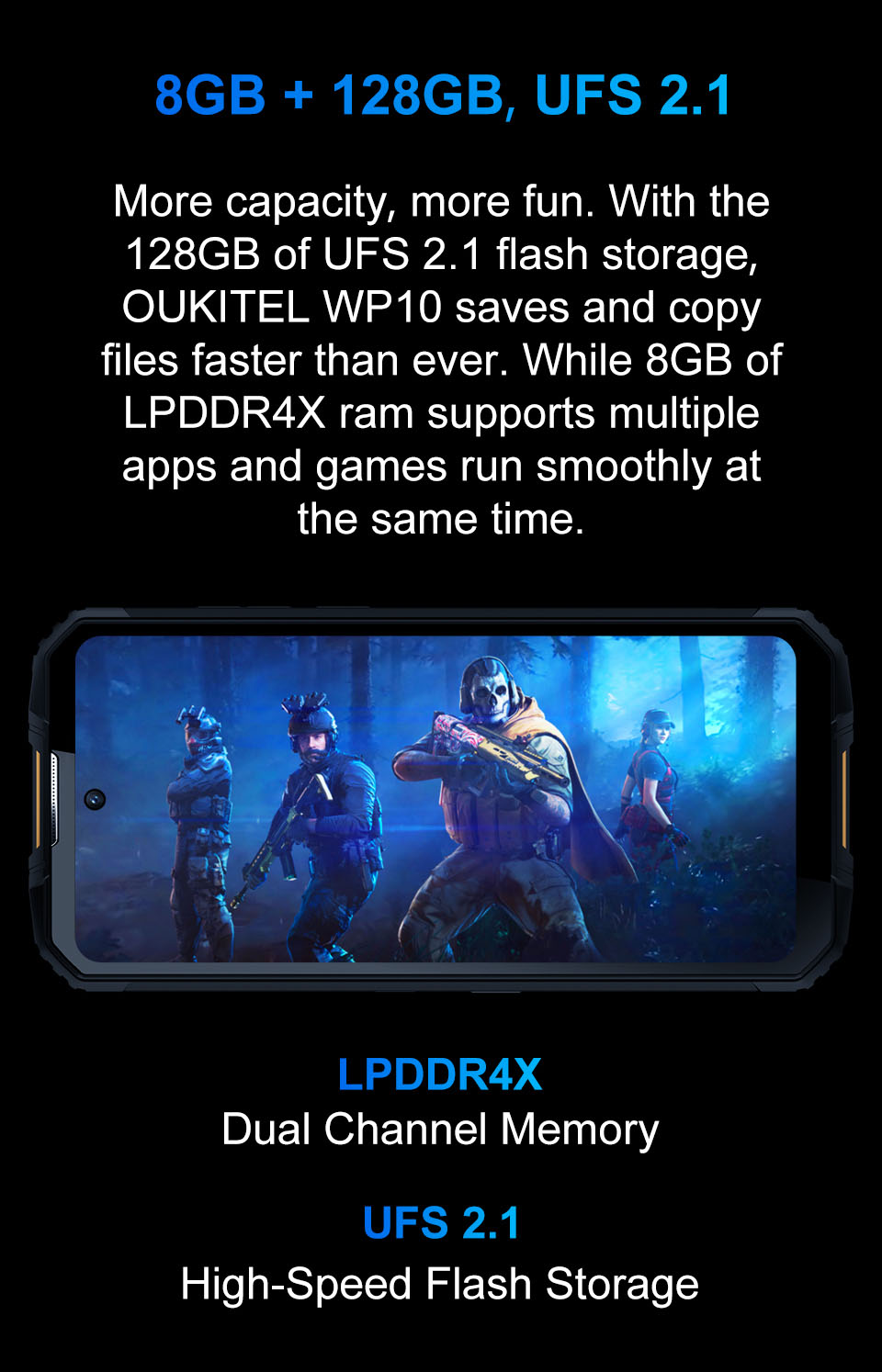 8 GB + 128 GB, UFS 2.1 - Mit 128 GB UFS 2.1-Flash-Speicher und 8 GB LPDDR4X-RAM speichert OUKITEL WP10 Dateien schneller als je zuvor und unterstützt die gleichzeitige Ausführung mehrerer Apps und Spiele.