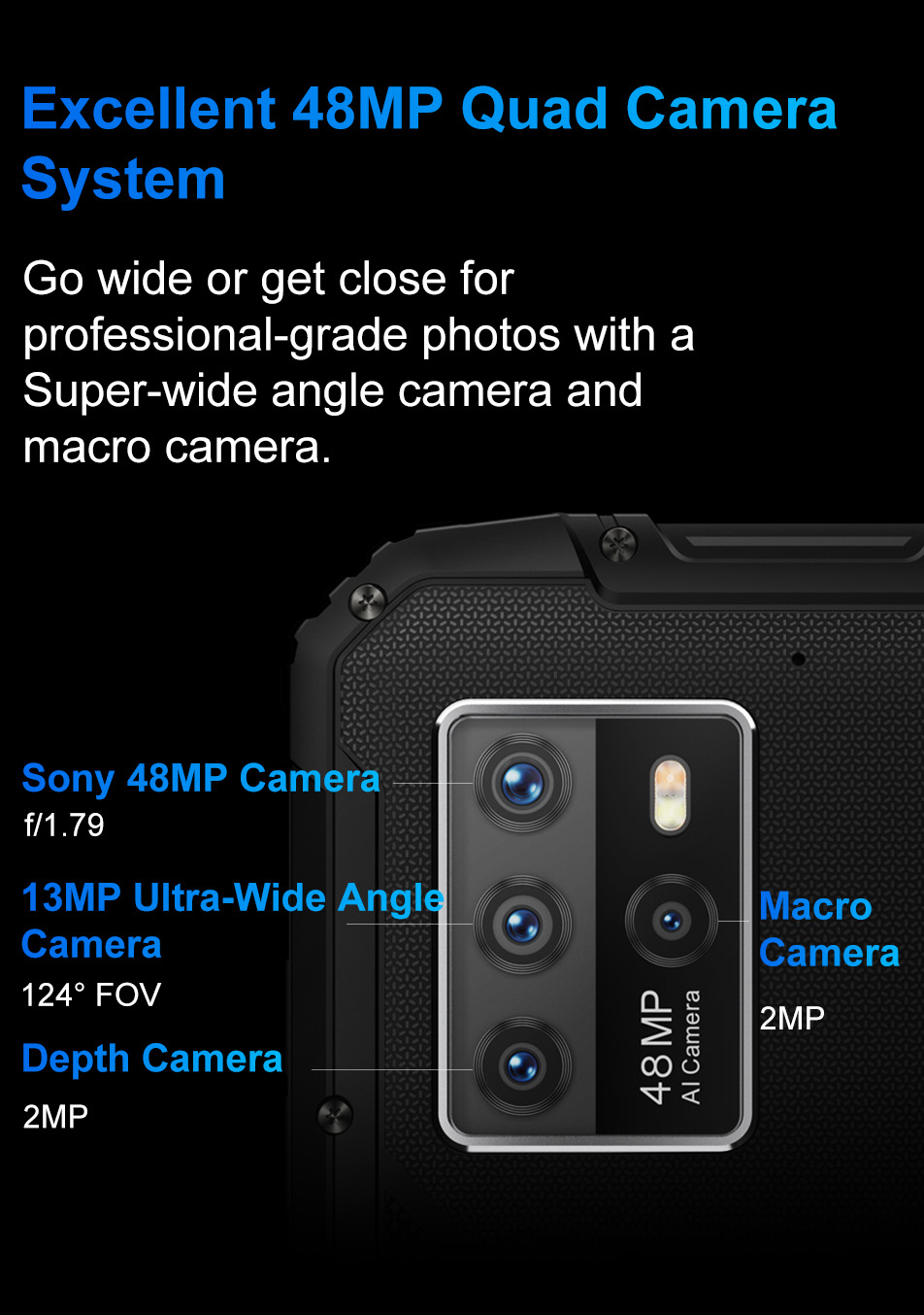⑥Ausgezeichnetes SONY 48MP Quad-Kamerasystem - enthält 48MP Sony IMX582-Hauptkamera, 13MP Samsung S5K3L6-Breitbildkamera, 2MP-Makro- und 2MP-Tiefenkamera.