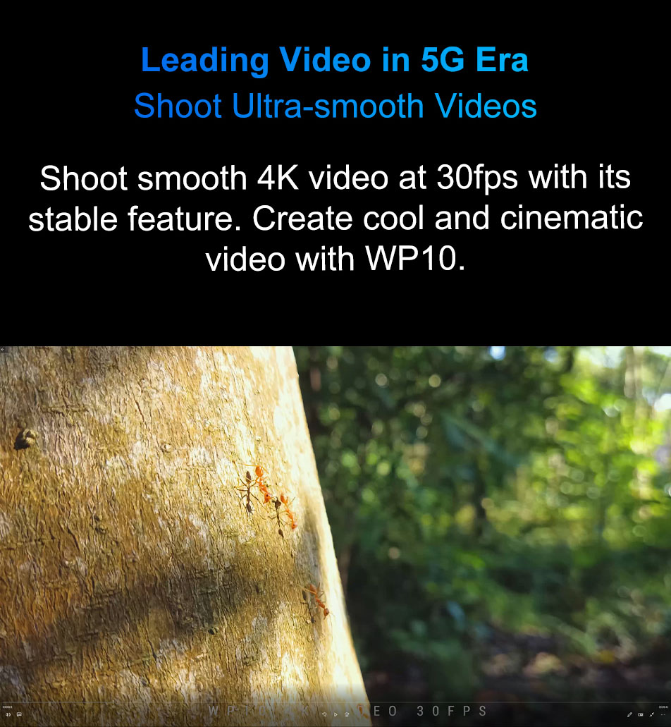 ⑦ Ultra-flüssige Videos aufnehmen - Mit seiner stabilen Funktion können Sie flüssige 4K-Videos mit 30 Bildern pro Sekunde aufnehmen. Erstellen Sie mit WP10 coole und filmische Videos.
