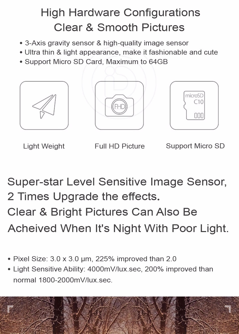 - 1296P video resolution, picture pixel can be up to 3.0MP, video and photo is wonderful.