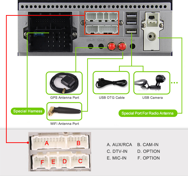 - Position: 3 USB auf dem Rücken, kann als Media/3G/4G/Kamera/DAB+/TPMS/Handy Anschluss