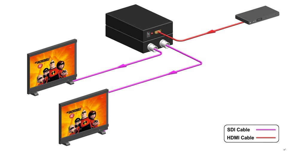Zeigt die HDMI-Quelle auf zwei SDI-Displays an.