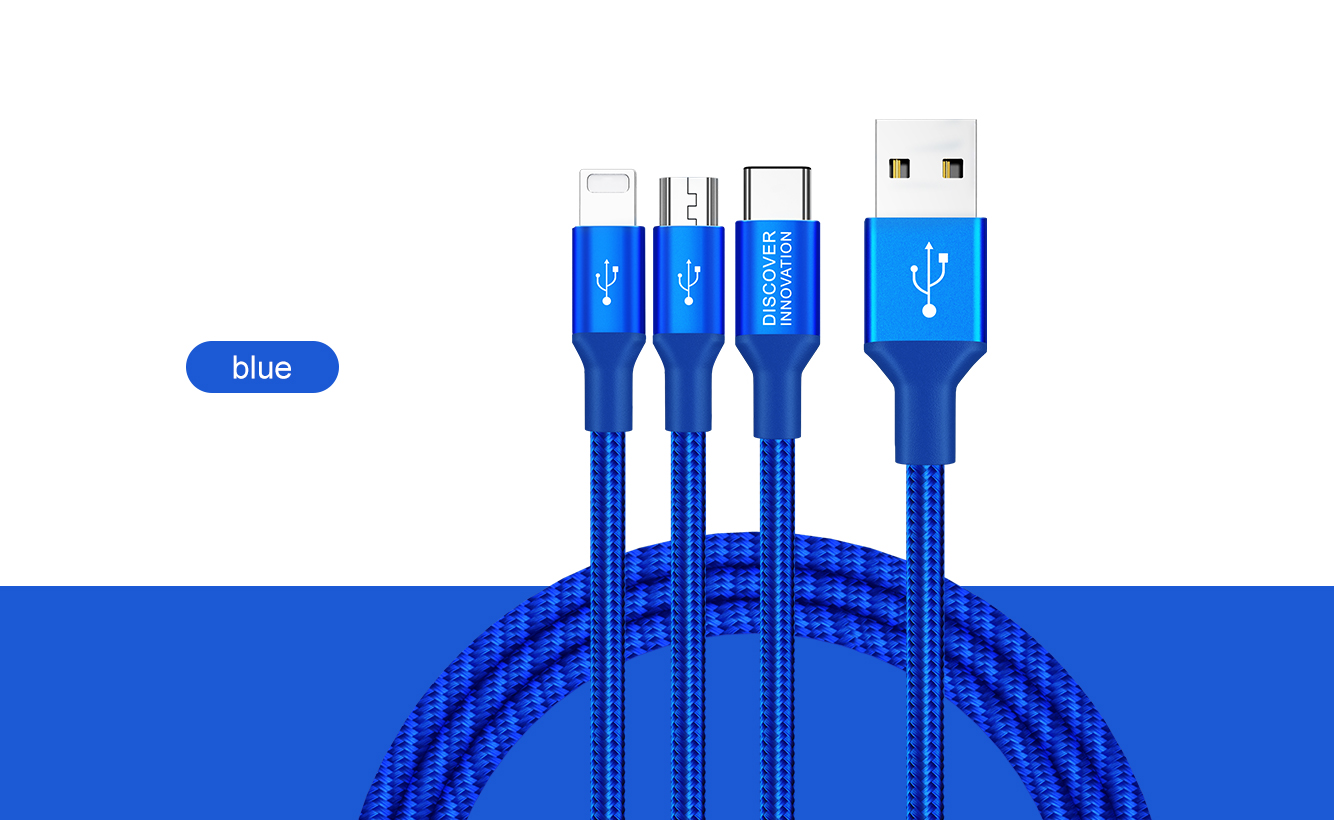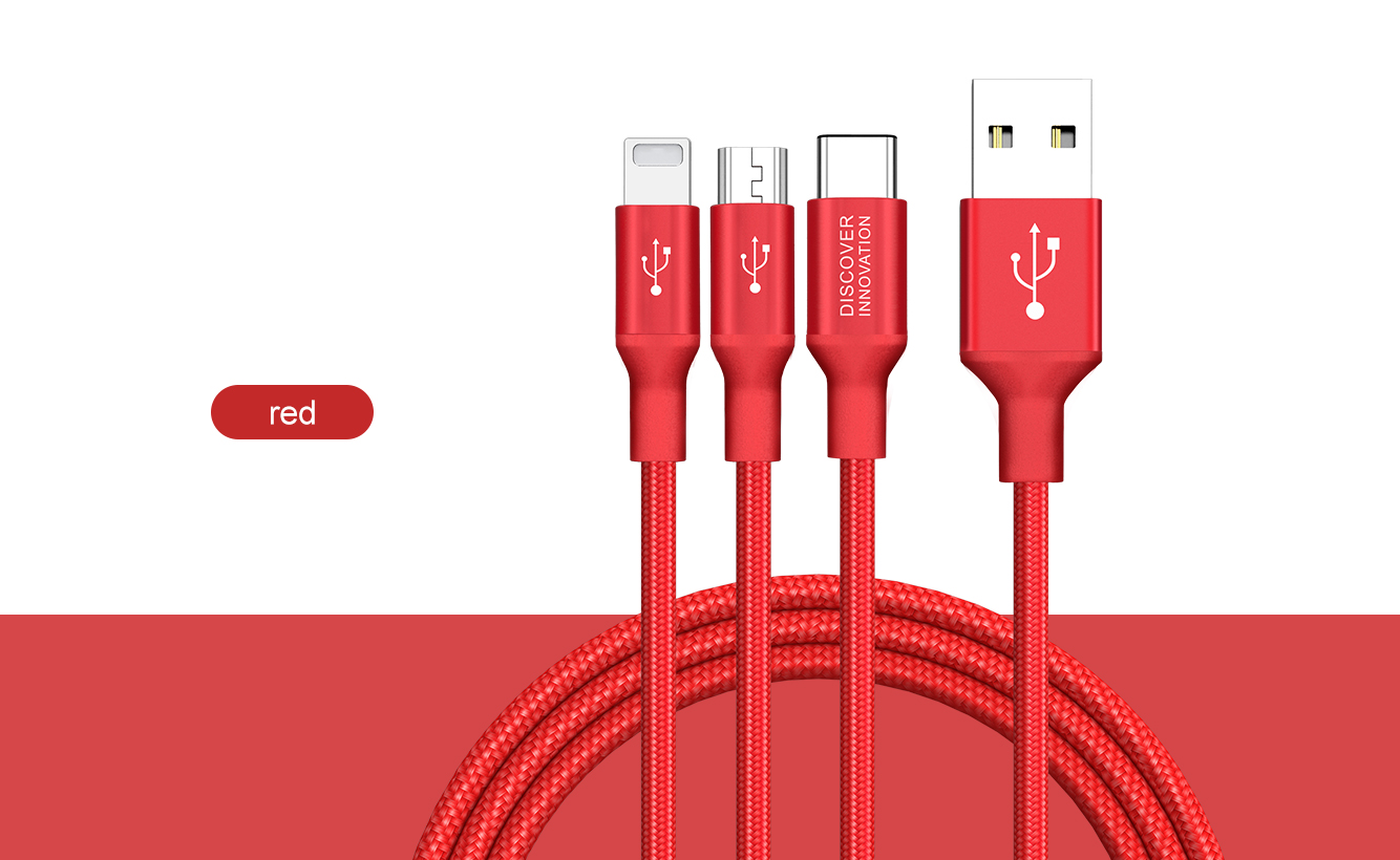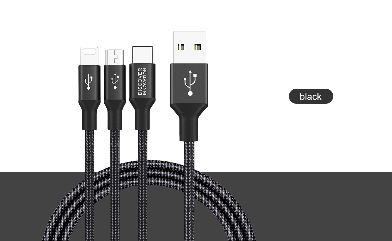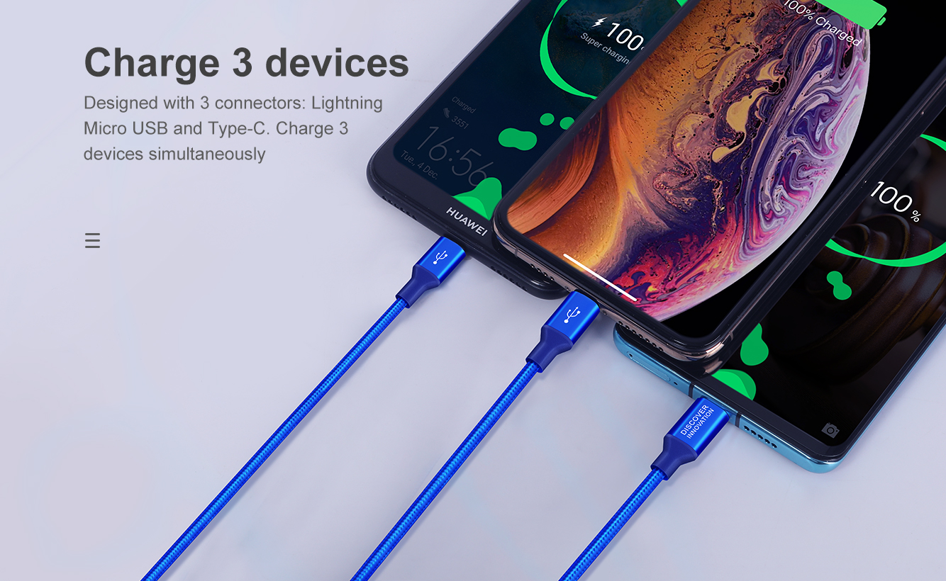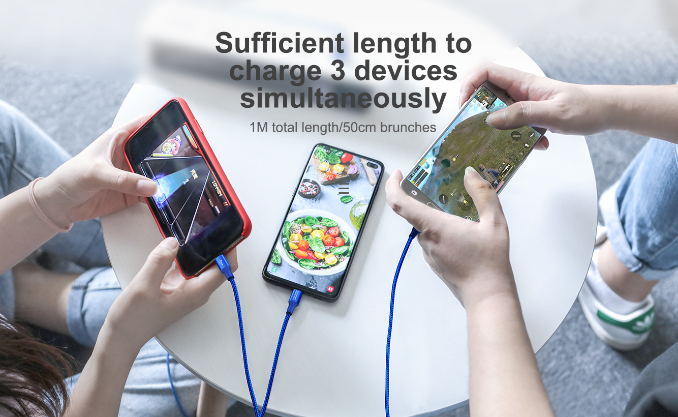 Hergestellt aus hochwertigem geflochtenem Nylon und einer hochreinen Aluminiumlegierung. Halten Sie Drehungen und Biegungen stand. Drei verschiedene Anschlüsse. Drei unabhängige intelligente Chips. 1 m Hauptkabel und 0,5 m Brunchkabel. Laden Sie 3 Geräte gleichzeitig auf.