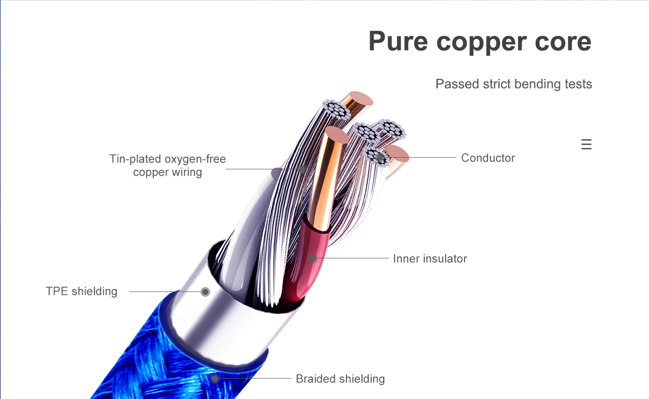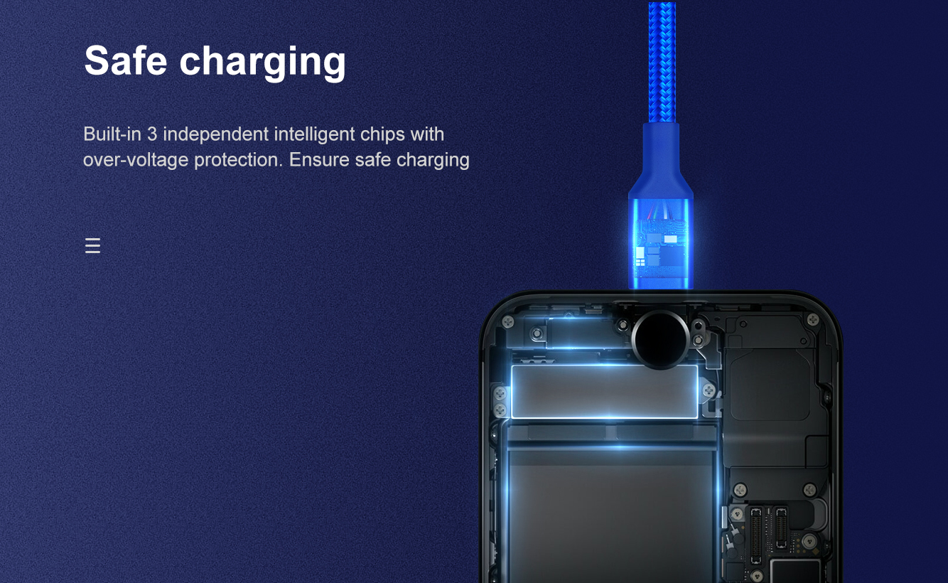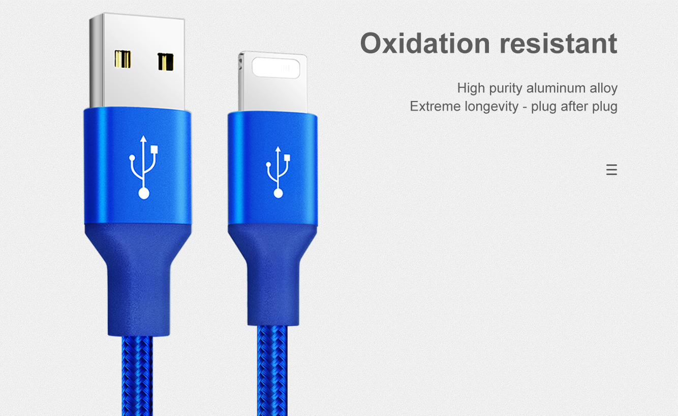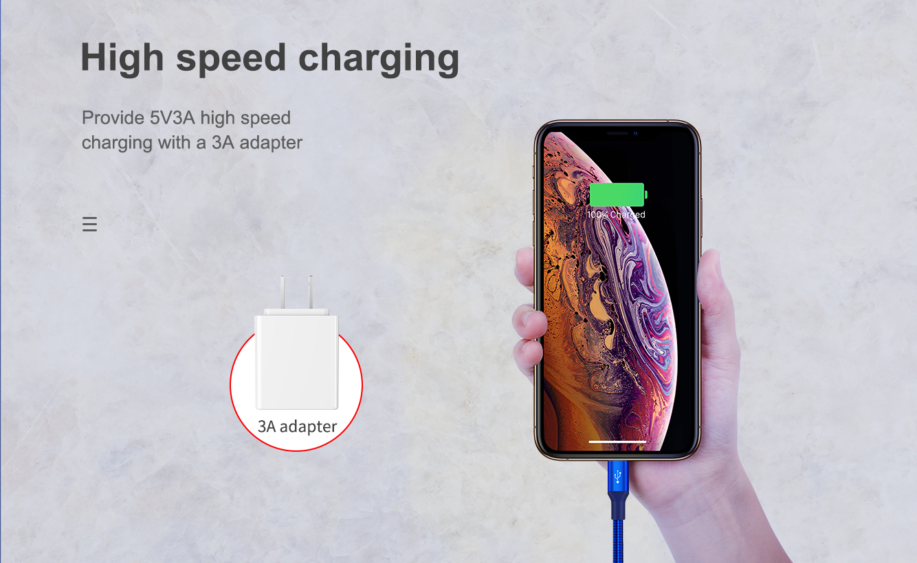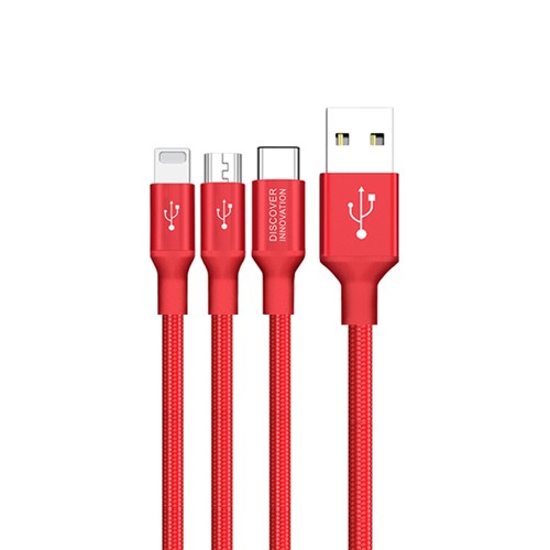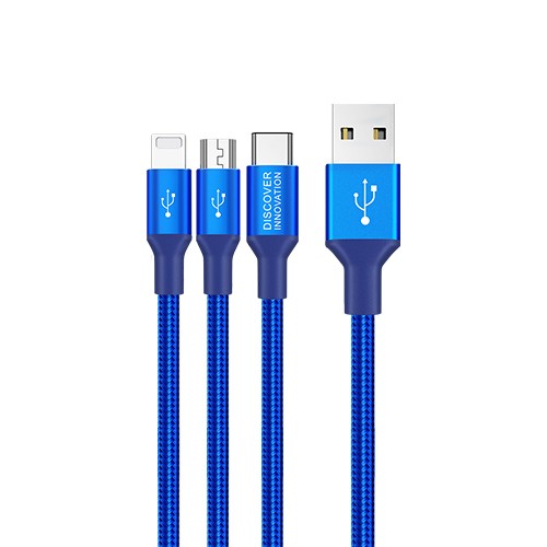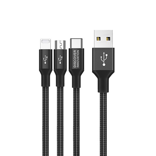 Hergestellt aus hochwertigem geflochtenem Nylon und einer hochreinen Aluminiumlegierung. Halten Sie Drehungen und Biegungen stand. Drei verschiedene Anschlüsse. Drei unabhängige intelligente Chips. 1 m Hauptkabel und 0,5 m Brunchkabel. Laden Sie 3 Geräte gleichzeitig auf.
