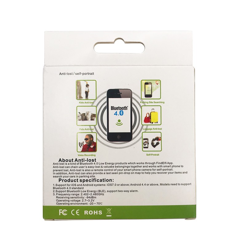 - Dieses Anti-verlorene Gerät nimmt späteste Bluetooth 4.0 Technologie des niedrigen Verbrauchs an und durch die entsprechende APP, um alle Funktionen zu verwirklichen.