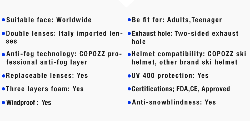 Aufgrund der starken sonnenlicht, reflektiert licht aus schnee berg und kalten wind stimulieren, die augen, wir empfehlen sie wählen eine sicherheit professionelle ski brille während die marke "COPOZZ" ist ihre beste wahl. COPOZZ ski goggle ist mehr fit für ihr gesicht und kann verhindern ihre augen von der schweren wind. Die objektiv ist aus importierten material und seine gespiegelt beschichtung gehärtet, scratch-beständig und abriebfest. Die brille sind 100% Anti-Uv, spielen eine schlüssel rolle in augen schutz