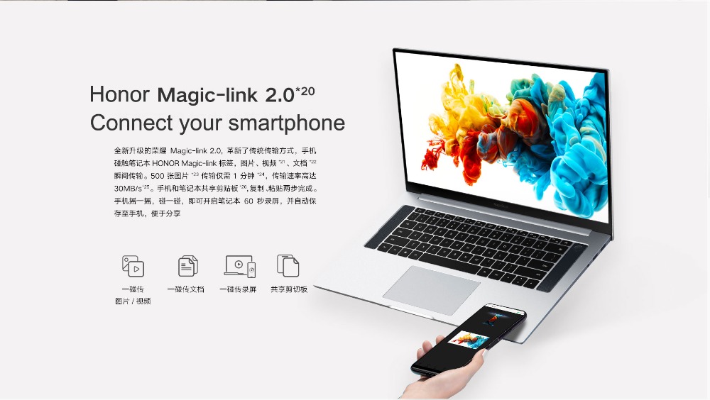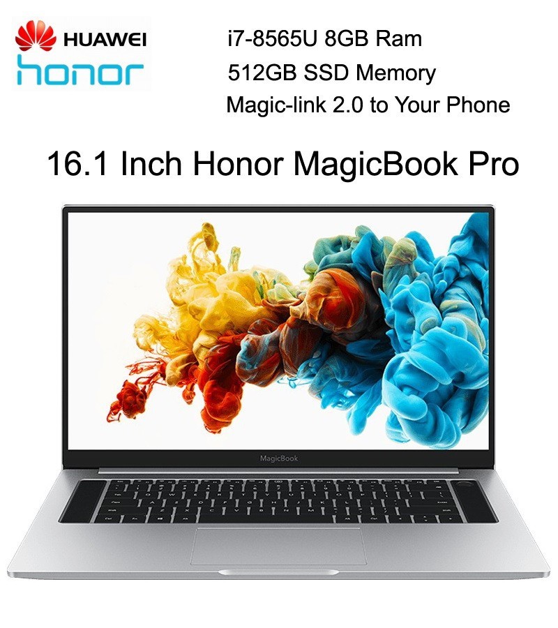 * Intel Core i7 der 8. Generation * -8565U-Prozessor, 8 GB RAM, 512 GB SSD-Speicher, NVIDIA Geforce MX250-Grafikkarte   * Die Pro-Version unterstützt Magic-Link 2.0, um Ihr Smartphone anzuschließen, mit Videos, Bildern usw. Zu teilen   * Vier Lautsprecher. Zusätzlich zu den beiden Lautsprechern auf der D-Seite befinden sich auf beiden Seiten der Tastatur hohe Lautsprecher für eine Hoch- und Niederfrequenzteilung. Sie können Benutzern eine hervorragende Audio- und Videoleistung beim Ansehen eines Videos bieten.   * Das Honor MagicBook Pro unterstützt 2 x 2 MIMO-Doppelantennen-WLAN, das auf Kompatibilität mit mehr als 200 Routern auf dem Markt getestet wurde. Es kann effektiv Signale erfassen und die Netzwerkgeschwindigkeit verbessern.   * Es kann über den Verbindungsmodus Magic-Link 2.0 an das Smartphone angepasst werden. Es kann einfach über die Computer-Haushälterin von Huawei mit dem Telefon verbunden werden. Die Übertragungsgeschwindigkeit zwischen ihnen kann bis zu 1 GB / min betragen. Eine automatische Sicherung kann realisiert werden.