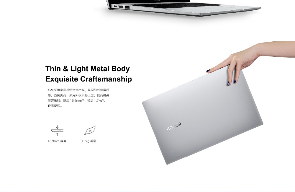 Das Honor MagicBook Pro hat eine Körperstärke von 15,8 mm, ein Bare-Metal-Gewicht von 1,7 kg und ein Reisegewicht von 1,84 kg. Es hat bestimmte Vorteile im Vergleich zu Produkten gleicher Größe. Dies ist ein sehr tragbarer Laptop.