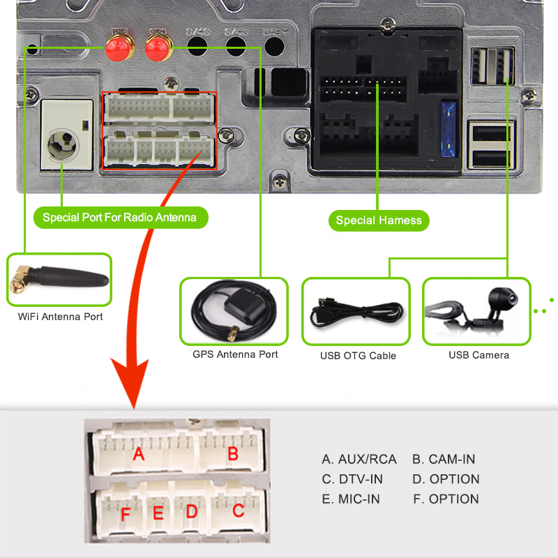 - Position: 3 USB auf dem Rücken, kann als Media/3G/4G/Kamera/DAB+/TPMS/Handy Anschluss