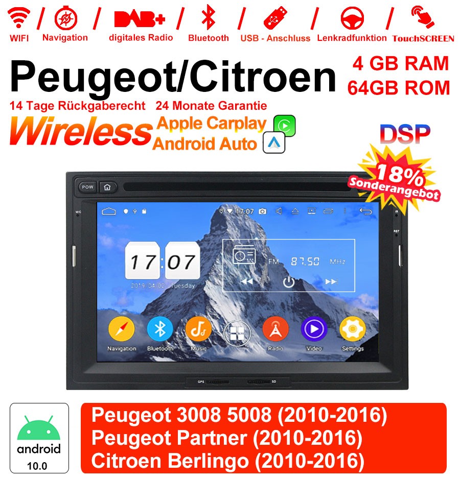 7 Zoll Android 12.0 Autoradio/Multimedia 4GB RAM 64GB ROM Für Peugeot 3008 5008 Partner / Citroen Berlingo Mit WiFi NAVI Bluetooth USB