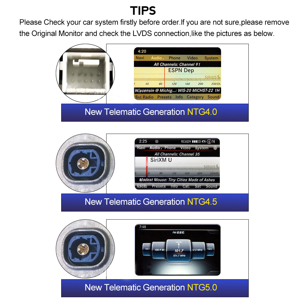 Hinweis: Wenn Sie vorab bestellen, überprüfen Sie bitte, ob Ihr Auto NTG 4.0 oder 4.5 oder 5.0 ist. Im Zweifelsfall wenden Sie sich bitte an unseren Kundendienst.