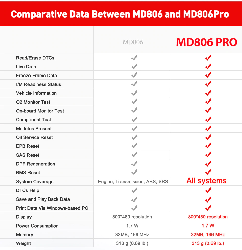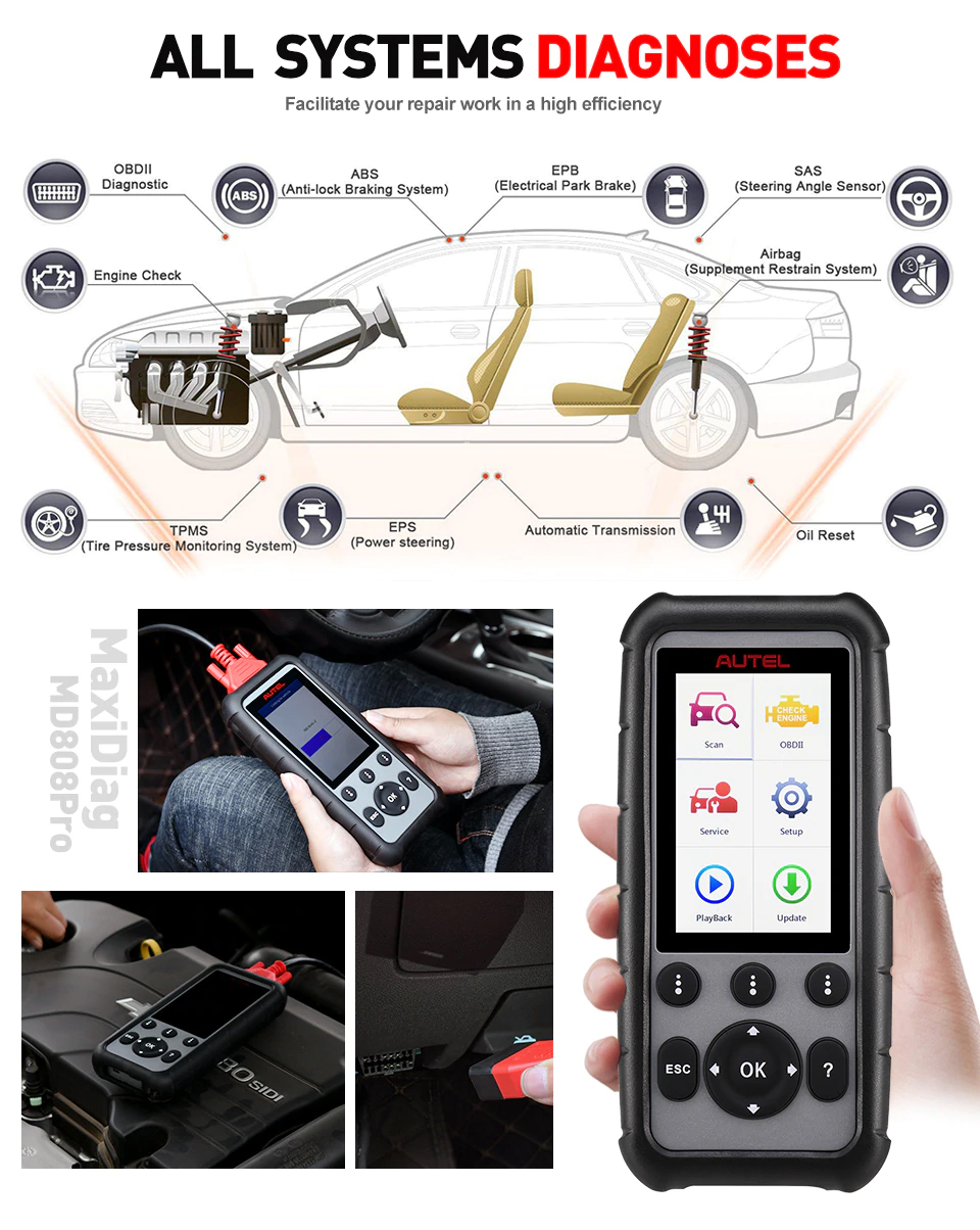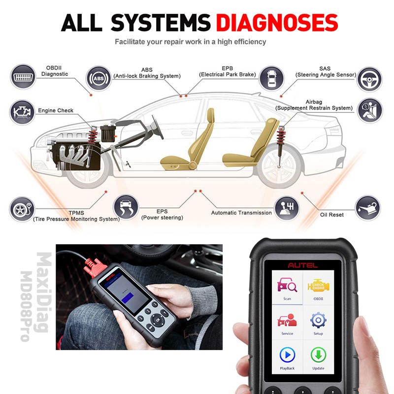 1. Alle Systemdiagnosen: Autel MD806 PRO bietet VOLLSTÄNDIGE Systemdiagnosen für grundlegende Diagnosen und Serviceleistungen für alle verfügbaren Module im Fahrzeug, während MD806 / MD808 nur VIER Systemdiagnosen für Motor, Getriebe, ABS und SRS bietet.