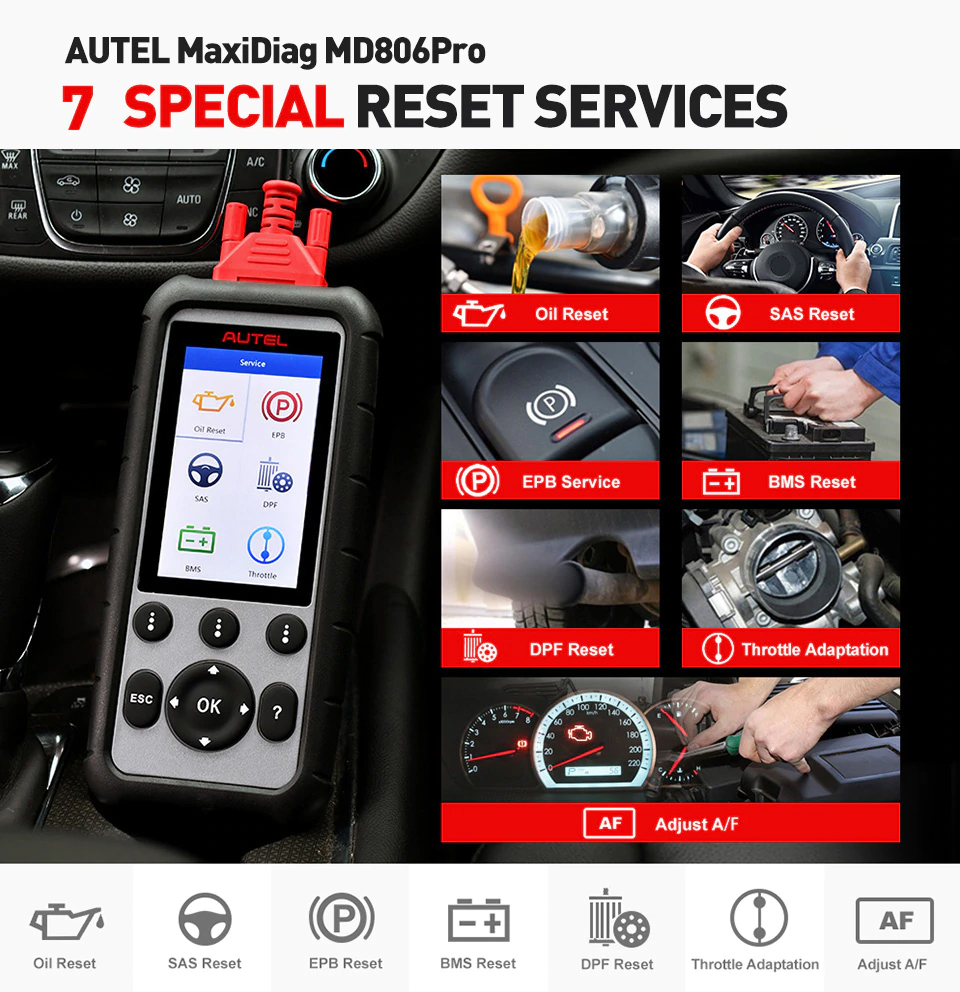 2. 7 Besonderheiten: Autel MD806 PRO / MD806 wurde speziell entwickelt, um im Vergleich zu MD808 (nur 5 Besonderheiten) zwei weitere Sonderfunktionen (Drosselklappenanpassung, A / F einstellen) hinzuzufügen.