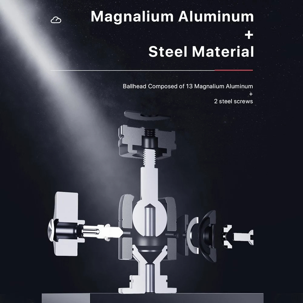 Vollmetallkonstruktion: Der Kugelkopf besteht aus einer 13-teiligen Magnalium-Aluminium-Legierung und 2 massiven und starken Stahlschrauben.