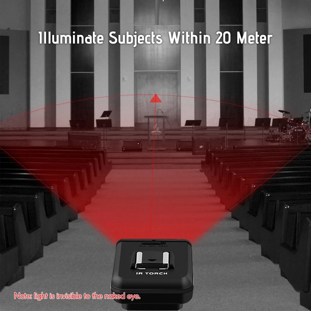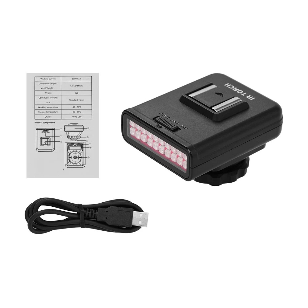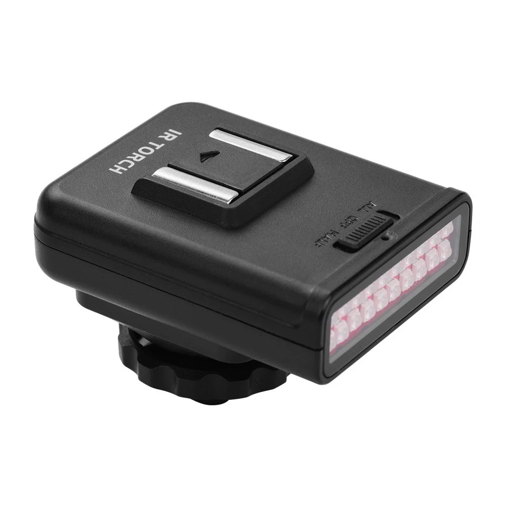 Ausgestattet mit kalten Schuhen, die als externes IR-Beleuchtungsgerät an DSLR-Kameras angeschlossen werden können; und mit 1/4 Zoll Gewindeloch, das das IR-Licht auf einem externen Stativ montieren kann.