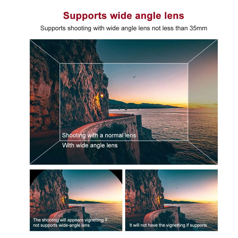 Unterstützt Weitwinkelobjektive und wird mit 8-teiligen Objektivadaptern (49 mm / 52 mm / 55 mm / 58 mm / 62 mm / 67 mm / 72 mm / 77 mm) geliefert.