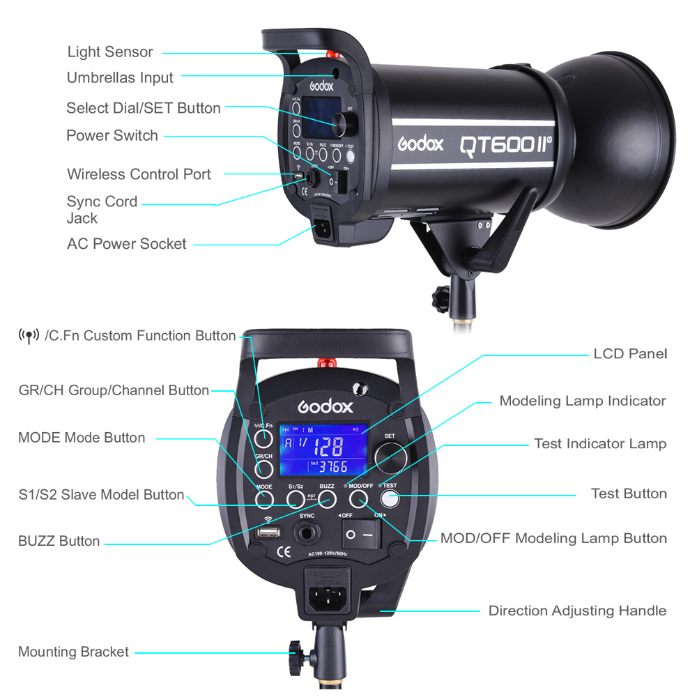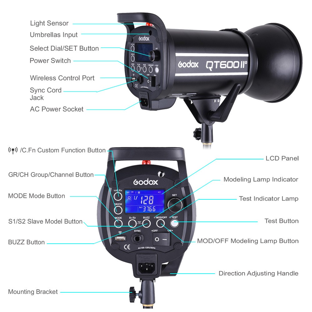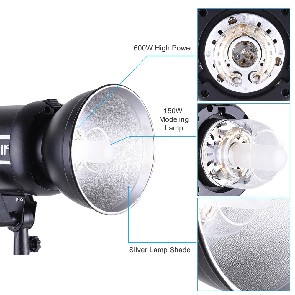 600 W Hochleistungs-Studioblitz, schnelle Recyclingzeit, kurze Blitzdauer und hohe Leitzahl des GN76.
