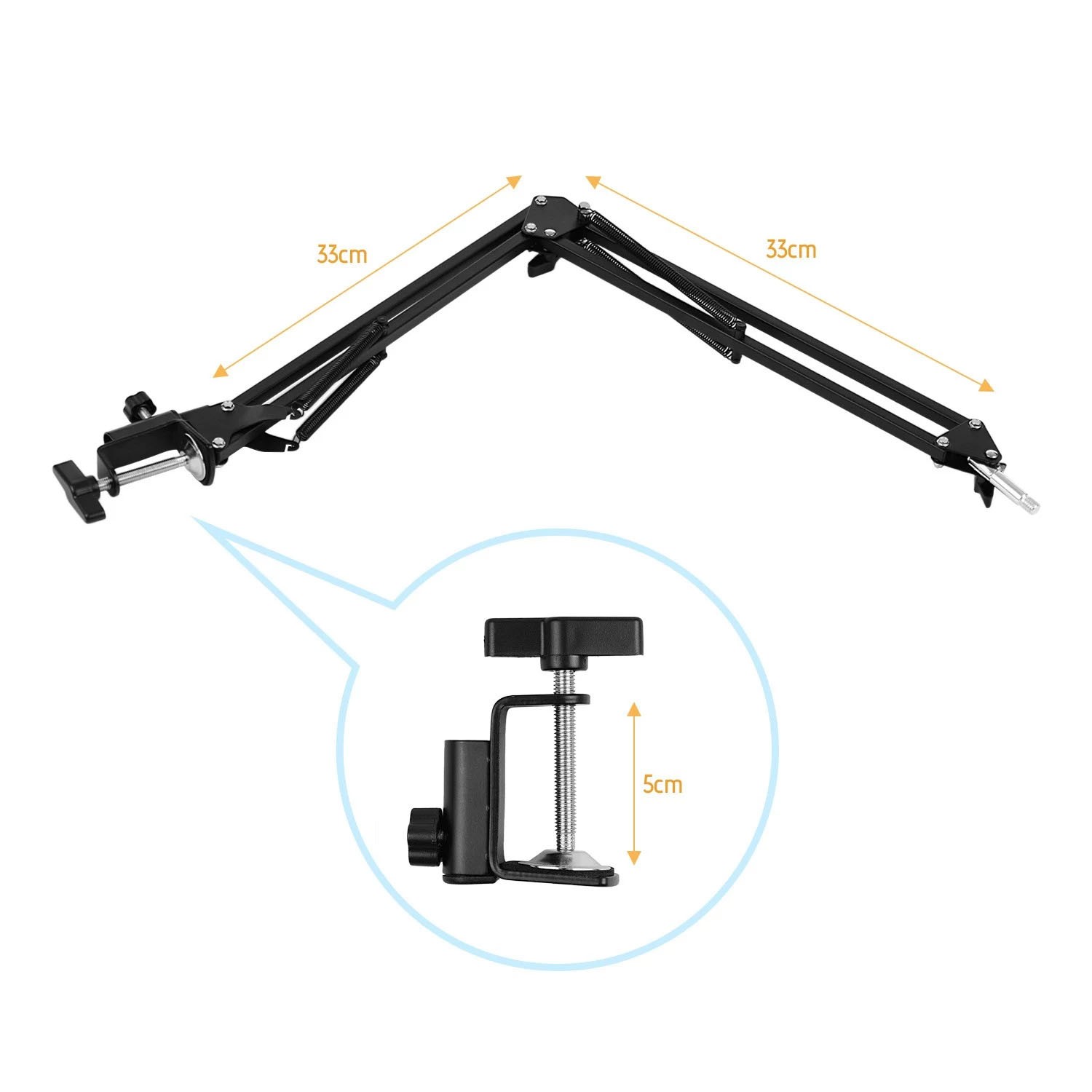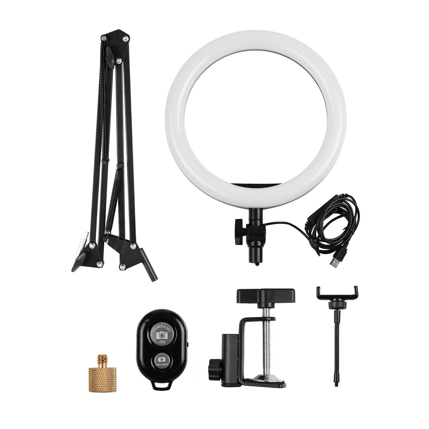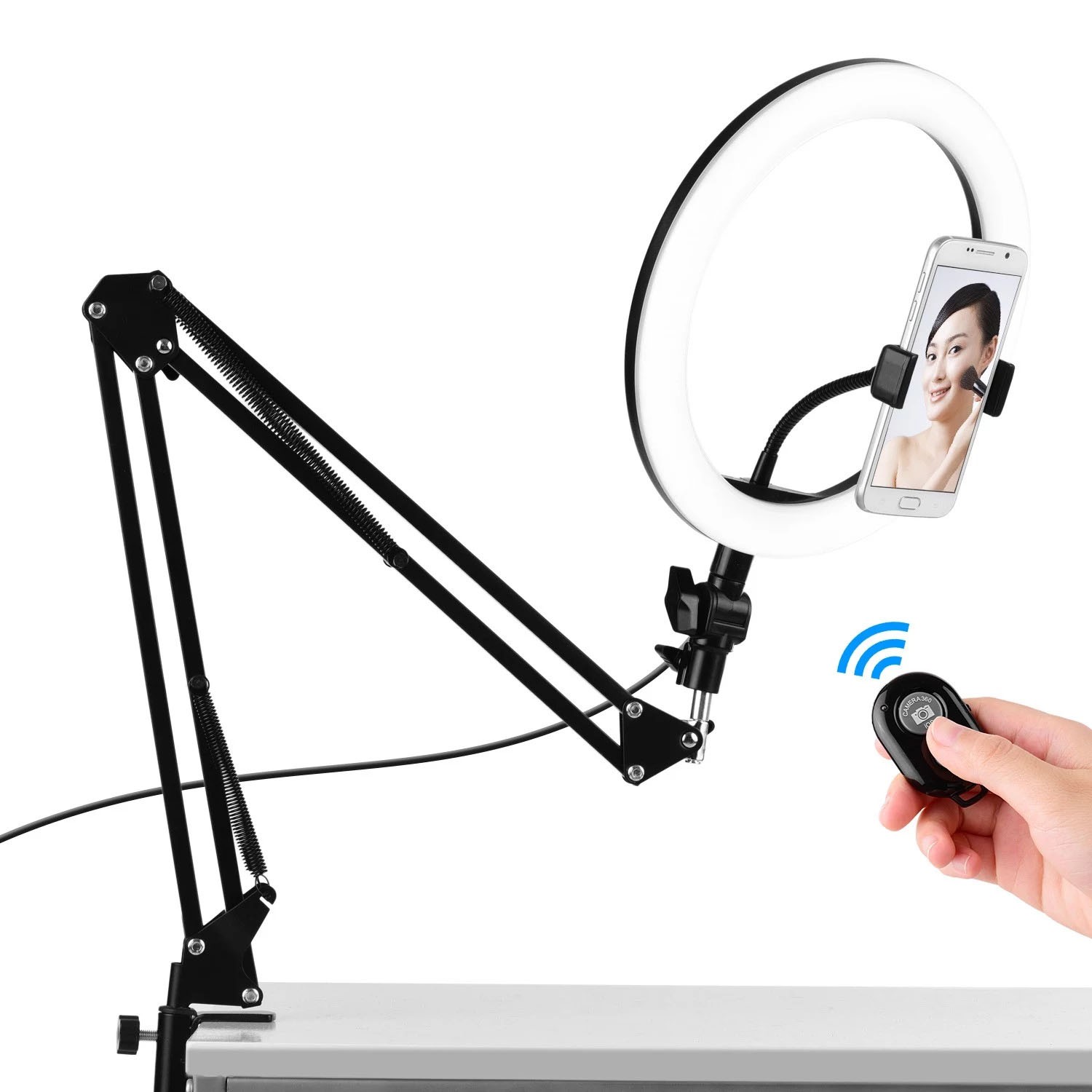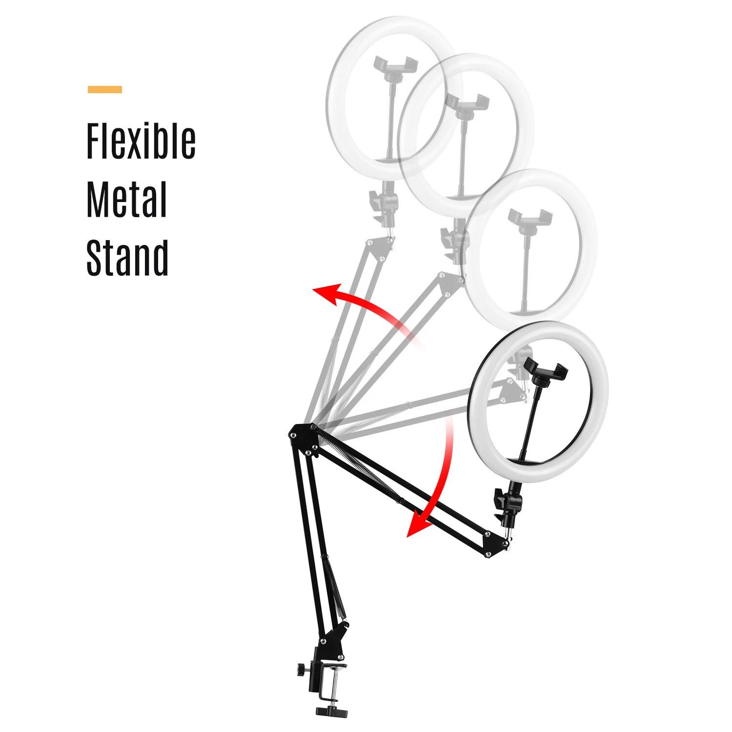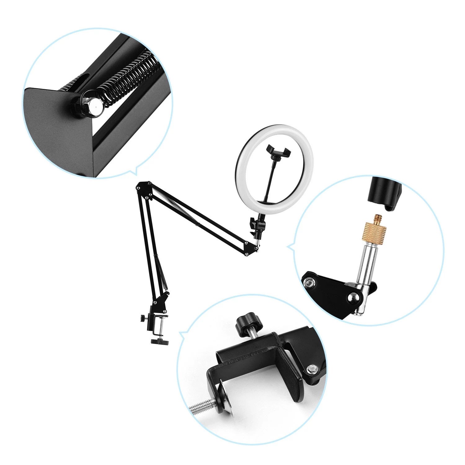 Mit dem mitgelieferten faltbaren Metallständer mit Klemme (max. Breite 5 cm) können Sie das Ringlicht einfach auf dem Schreibtisch montieren und den Verwendungswinkel des Ringlichts flexibel einstellen.