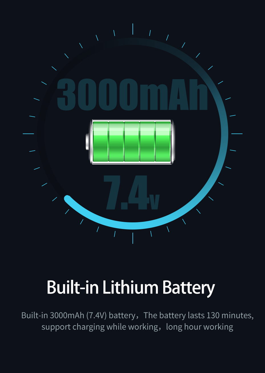 Eingebauter Lithium-Akku (3000mAh, 7,4V). Die Batterie kann 130 Minuten lang halten.