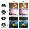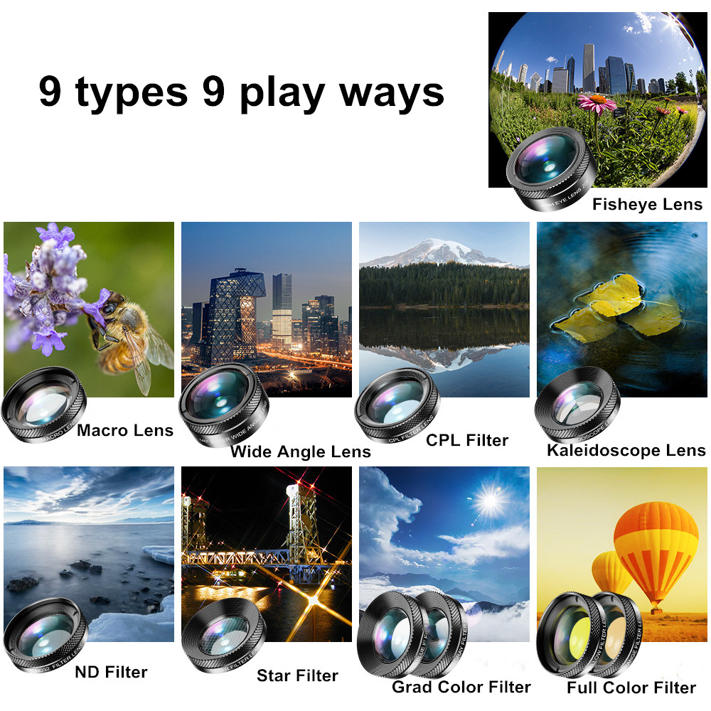 Dies ist eine neue entwickelt professional camera lens kit mit 140 ° weitwinkel, 25x makro, 205 ° fisheye, Voller Gelb/Orange, Grad blau/grau fliters, CPL, ND32, kaleidoskop Objektiv 3 und Stern filter in einem set, erfüllt ihre verschiedenen bedürfnisse der fotografie.
