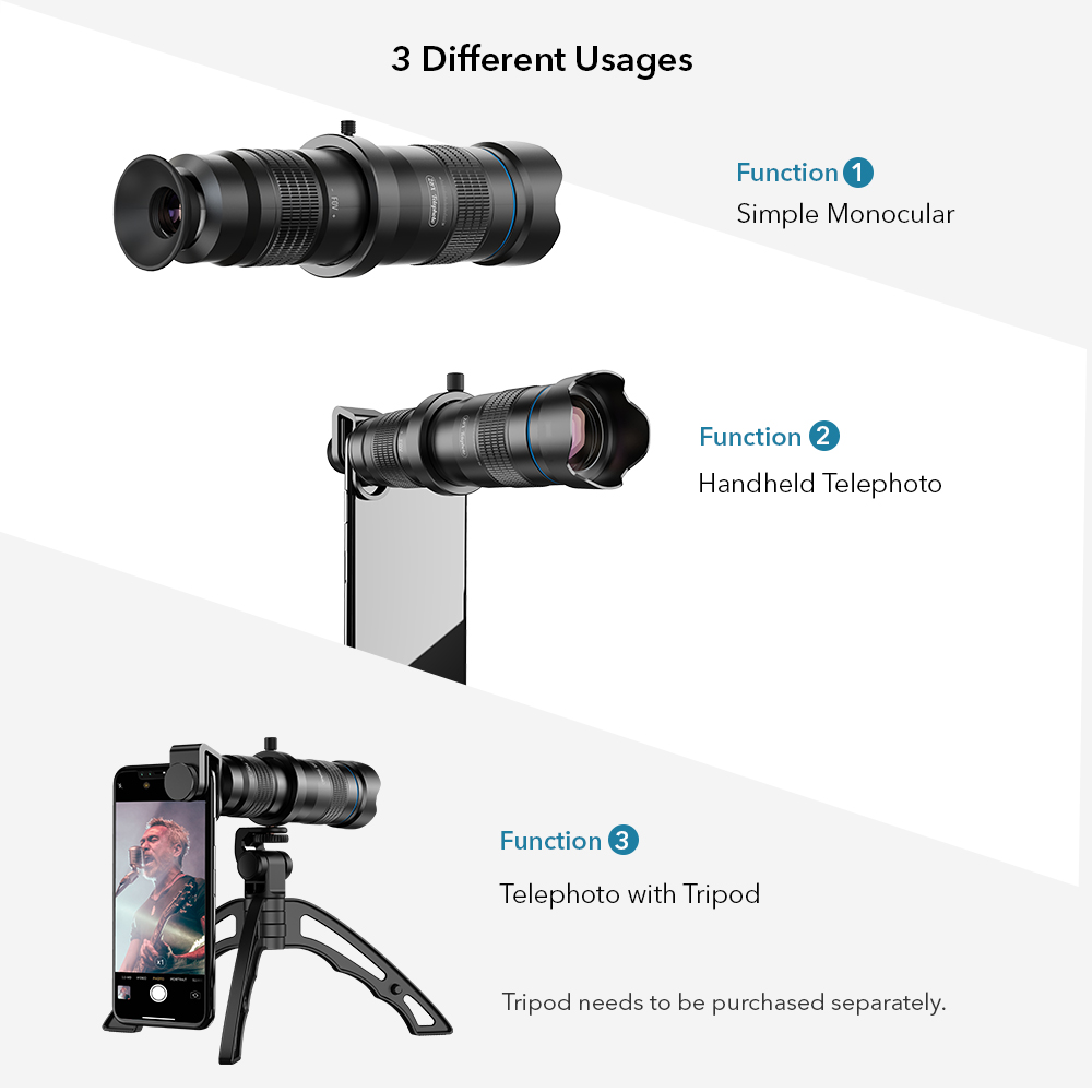 RÜCKSICHTS DESIGN MIT STABILEN STATIV: dieses handy teleobjektiv kommt auch mit eine ausgewogene stativ und die stativ kann ein selfie stick.