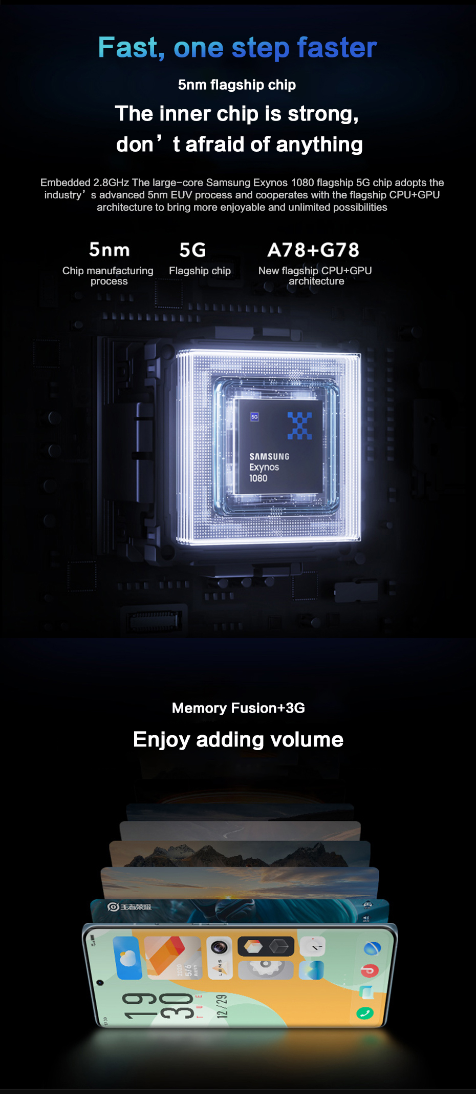 CPU: Exynos 1080 (5 nm) ,  Octa-Core (1 x 2,8 GHz und 3 x 2,6 GHz und 4 x 2,0 GHz)