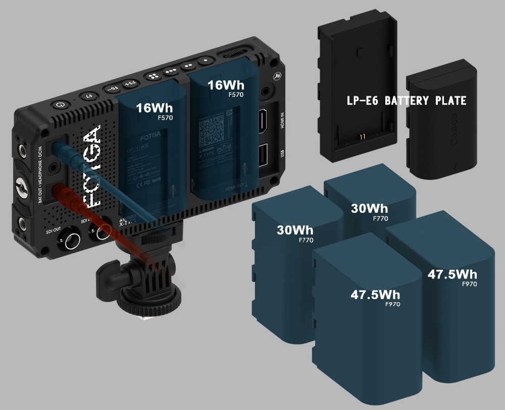 Dual batterie fach für NP-F NP-FM/QM batterien, und dies würde verlängern ihre arbeitszeit erheblich. Sie können auch verwenden LP-E6 batterie (batterie platte für LP-E6 müssen separat kaufen). wenn der strom durch NP-F oder LP-E6 batterie oder eine dummy batterie, es ist auch eine batterie ausgang für power ihre kamera direkt von monitor.