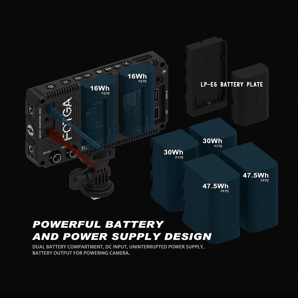 Dual batterie fach für NP-F NP-FM/QM batterien, für Sony NP-F970, F550, F570, F770, f750, und dies würde verlängern ihre arbeitszeit erheblich. Auch kann arbeit mit LP-E6 batterie (müssen separat kaufen). , Wenn angetrieben durch NP-F oder LP-E6 batterie oder eine dummy batterie, es ist auch eine batterie ausgang für power ihre kamera direkt von monitor.