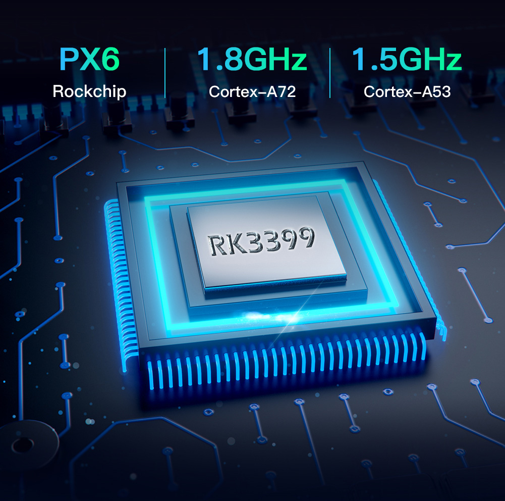 ● Android 10.0 mit Rockchip PX6 2 core A72 + 4 core A53 2.0GHz CPU, 4GB DDR4 + 64GB EMMC, GPU: Mali-T600MP4 + Google Play Stores für zahlreiche Android-Apps.