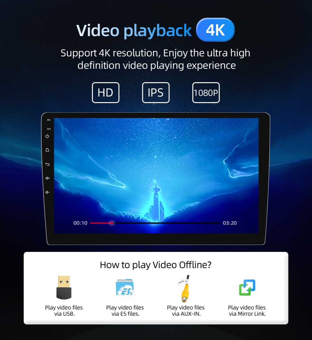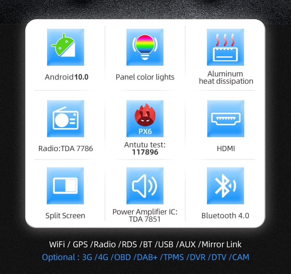 ● Android 10.0 mit Rockchip PX6 2 core A72 + 4 core A53 2.0GHz CPU, 4GB DDR4 + 64GB EMMC, GPU: Mali-T600MP4 + Google Play Stores für zahlreiche Android-Apps.