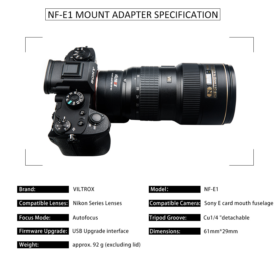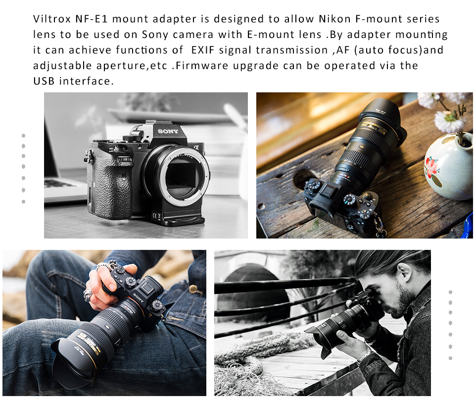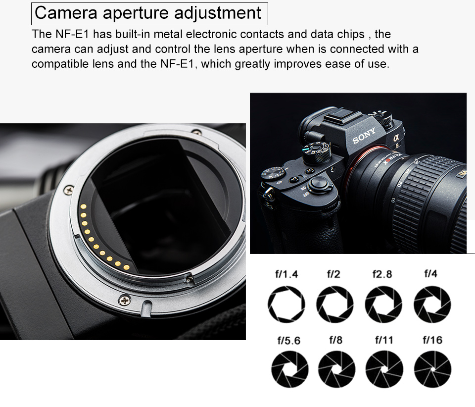 Viltrox NF-E1 mount adapter ist so konzipiert, dass Nikon F-mount serie objektiv verwendet werden auf Sony kamera mit E-mount objektiv. Durch adapter montage es erreichen können funktionen von EXIF signal übertragung, AF (autofokus) und einstellbare blende, etc.